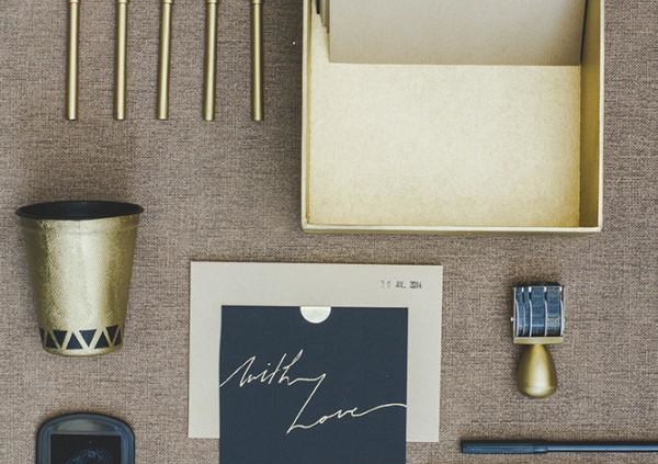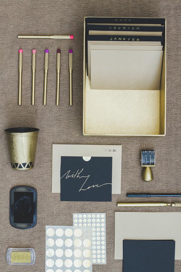 5. Bombez enfin la boîte, ainsi que le tampon dateur en doré. Le reste de votre travail consistera, le jour J, à mettre en scène les différents éléments de votre boîte à « archives d’une belle journée » : crayons dans les gobelets, quelques feutres or, des gommettes dorées… et bien entendu le tampon dateur avec son encre pour que vos invités puissent choisir « leur » jour. L’avantage des enveloppes est qu’elles invitent à y cacher toute sorte de choses : des photos instantanées, une fleur trouvée au jardin, un billet, un jeu à gratter…