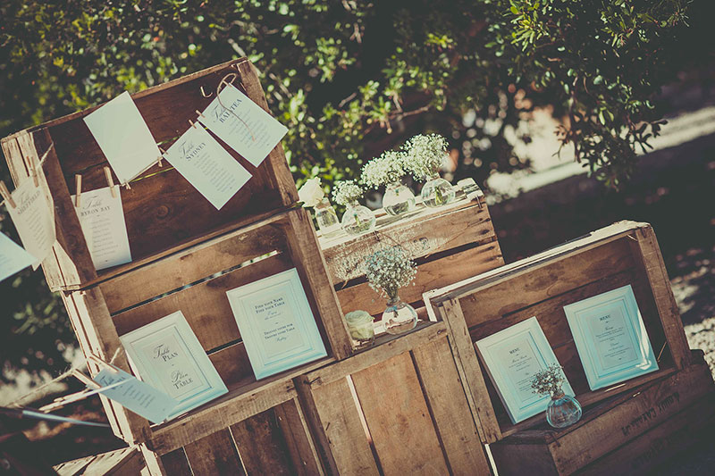 La mariée souhaitait la présence de vieilles caisses à pommes. Un classique dans un thème rétro. Celles-ci ont trouvé leur place pour le plan de table qui a été pensé de manière originale. En revisitant ces anciennes caisses à pommes à l’aide d’une vieille échelle de bois, elles ont servies de structure pour un plan de table en suspension. Des mini compositions florales venaient donner du rythme et de la douceur au bois brut et à cette scénographie en général. Chacun des noms des tables représentaient les différents pays visités par les mariés fixés par de vieilles pinces à linge en bois sur une jolie ficelle ancienne.