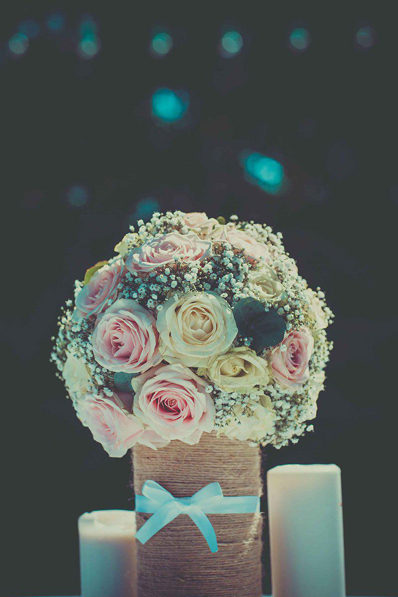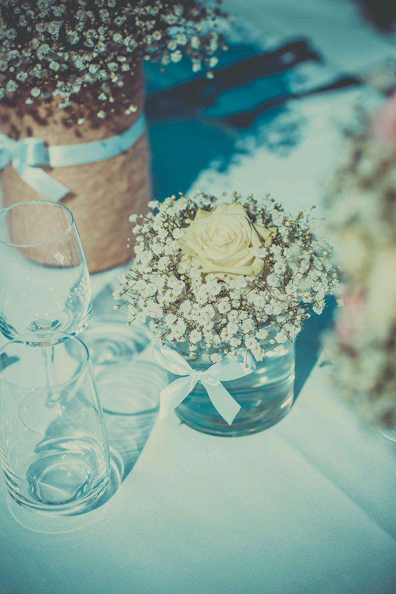 Pour l’espace dîner, l’accent a été de nouveau posé sur l’harmonie et la cohérence, essentielles à une décoration réussie. De magnifiques centres de tables – petit cadeau de la part de Label’ Emotion Provence pour les mariés -composés également de gypsophile, de roses et d’eucalyptus. Ils ont été confectionnés en boules de fleurs, déposés à même des contenants customisés à la main par nos soins avec de la vieilles ficelles qui assurait le côté rétro. La touche romantique venait finaliser la composition avec de jolis nœuds de satin blanc.