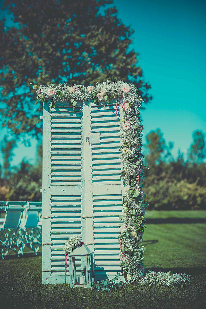 L’entrée de la mariée se devait d’être majestueuse, c’est pourquoi ce spot était d’une importance capitale pour l’ensemble de l’équipe Label’ Emotion Provence. Nous avons alors délicatement retravaillé deux vieilles persiennes en bois en les ornant d’un mélange astucieux de roses avalanche blanches et roses, de gypsophile et d’eucaplyptus : un subtil mélange pour une merveilleuse ambiance bucolique mariant l’ancien, le rétro et le romantique chic. Une jolie réussite immortalisée par nombres de photographies prises par les invités.
