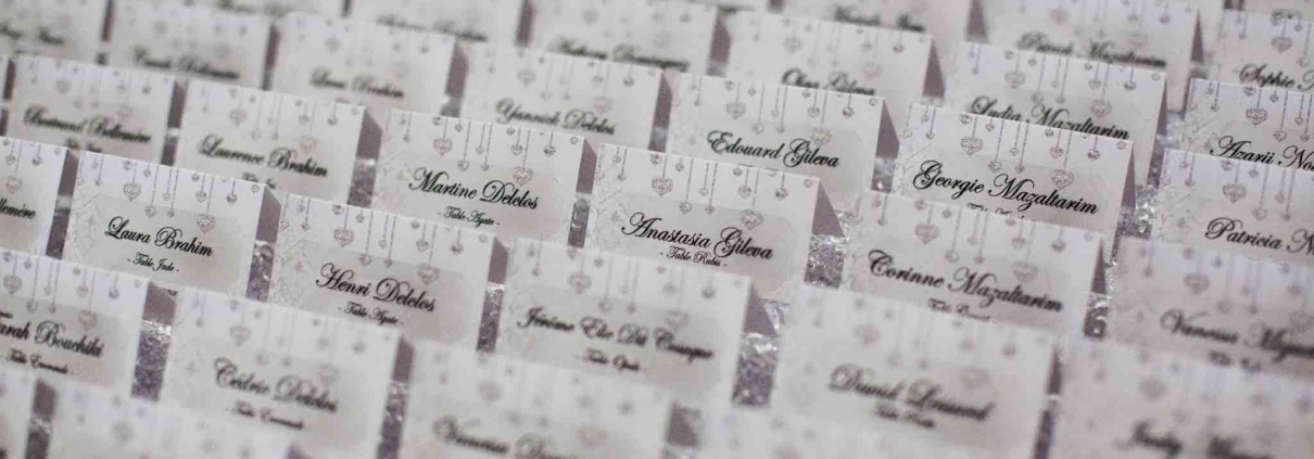 Vous devez placer vos marques places sur les tables avec le nom de chaque invité. A l’entrée de votre salle de réception, à la place de l’habituel plan de table, vous placerez vos escort cards. Celles-ci se présentent sur de petits cartons, où est noté le nom de chaque invité ainsi que le nom ou le numéro de sa table. Chaque convive prend son carton en arrivant et se dirige vers sa table.