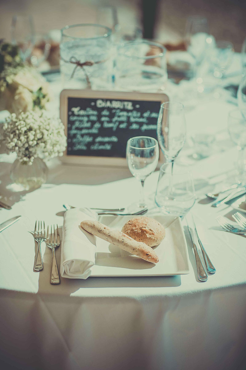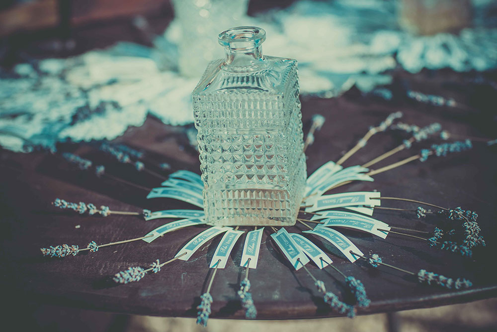 Le plan de table également créé par nos wedding planner avec des marques places customisés d’étiquettes et de brins de lavandes éteint disposés sur une vielle table en fer forgé. De vieilles bouteilles d’alcool ont servis tant sur le plan scénographique qu’utile puisqu’elles venaient soutenir chaque marques places.