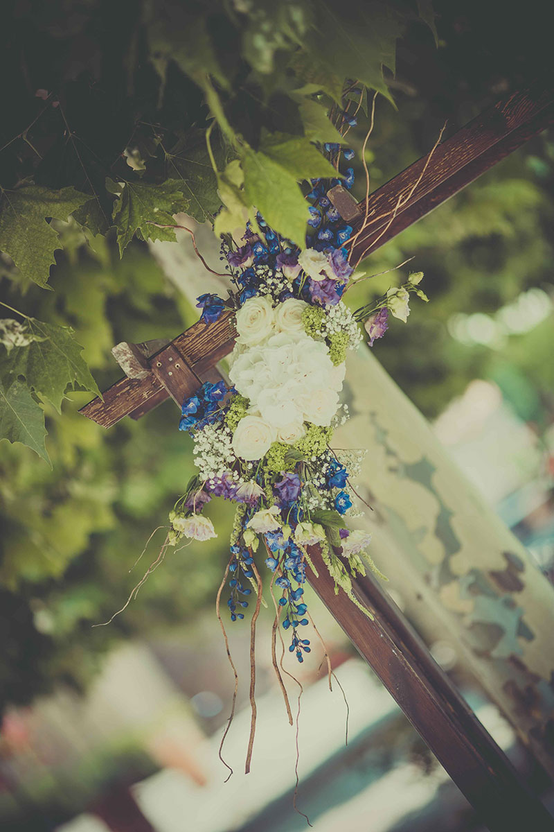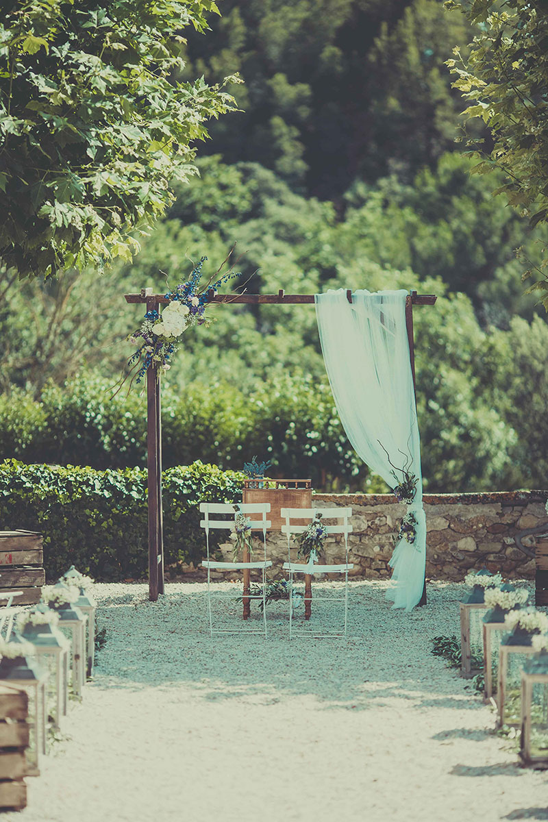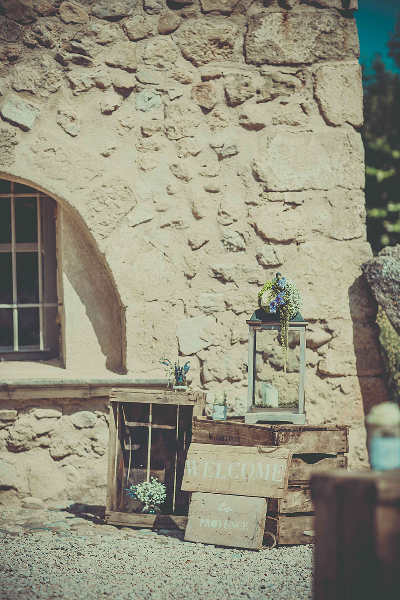 Label’ Emotion Provence a créé et designé la cérémonie laïque : arche en bois pour assurer le coté naturel de l’ancien embellit par une composition florale qui elle, assurait le côté chic. Une allée avec des lanternes anciennes séparée par des rameaux d’oliviers mettait en relief le côté Provence. Une scénographie de bienvenue avec de vieilles caisses à pommes accueillait convives et donnait le top départ au cortège : une ambiance  très chic dans un cadre plus que magnifique.