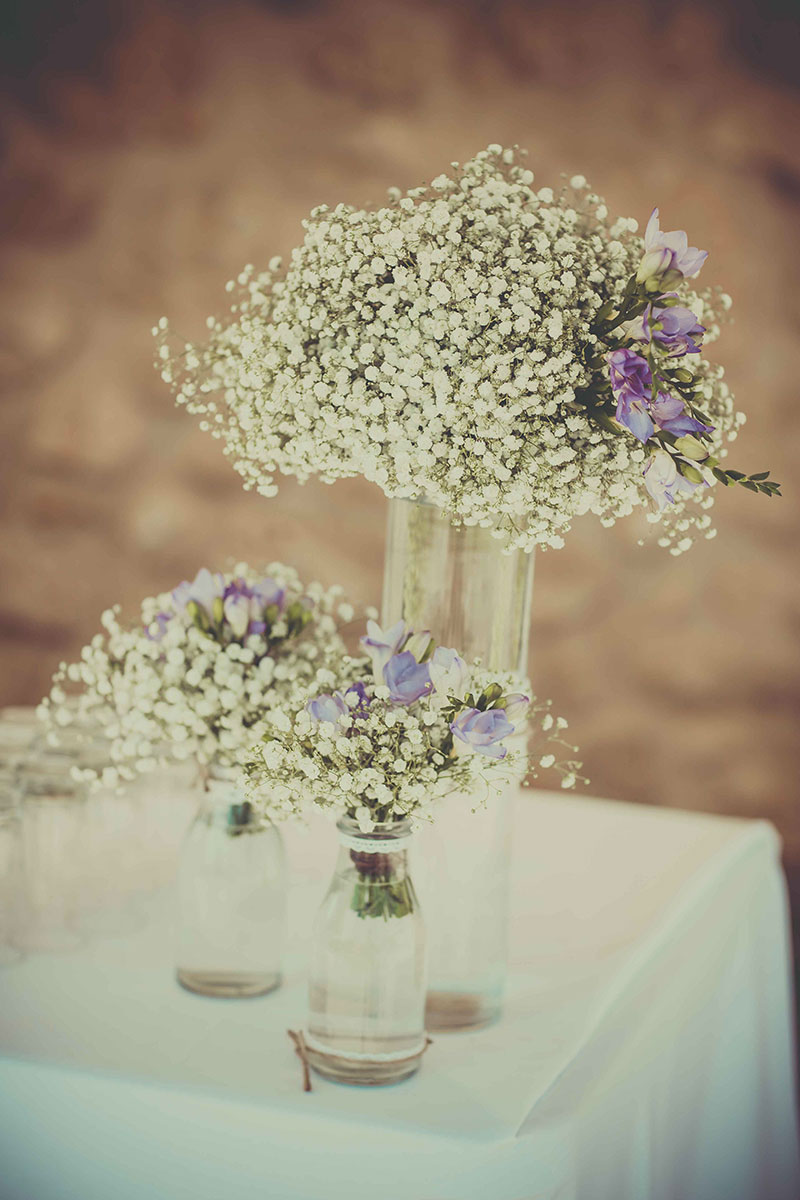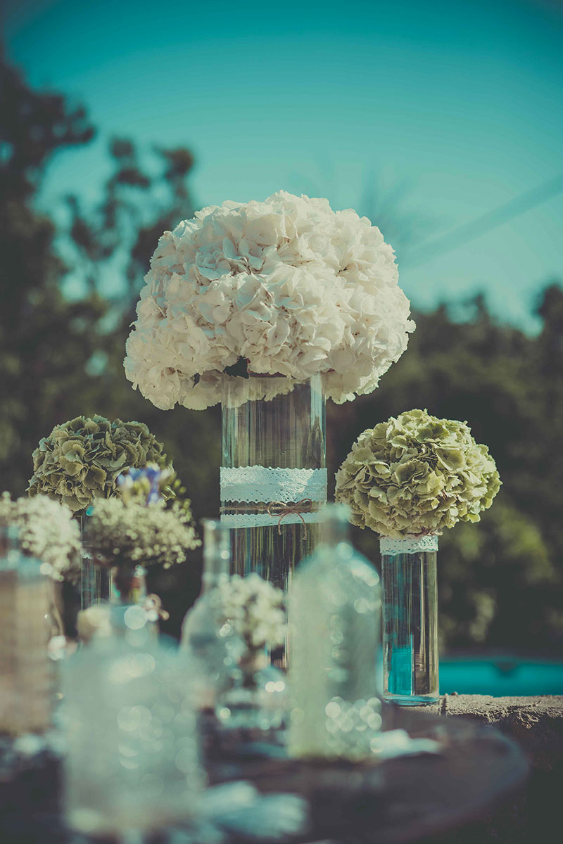 L’espace cocktail, quant à lui, était décoré avec soin par nos organisatrices de mariage,  avec des compositions florales d’hortensias blancs et de gypsophile. Disposées sur le buffet ancien dans de grands contenants transparents customisés de dentelles et de ficelles, ils permettaient de faire perdurer cet esprit ancien et chic.
