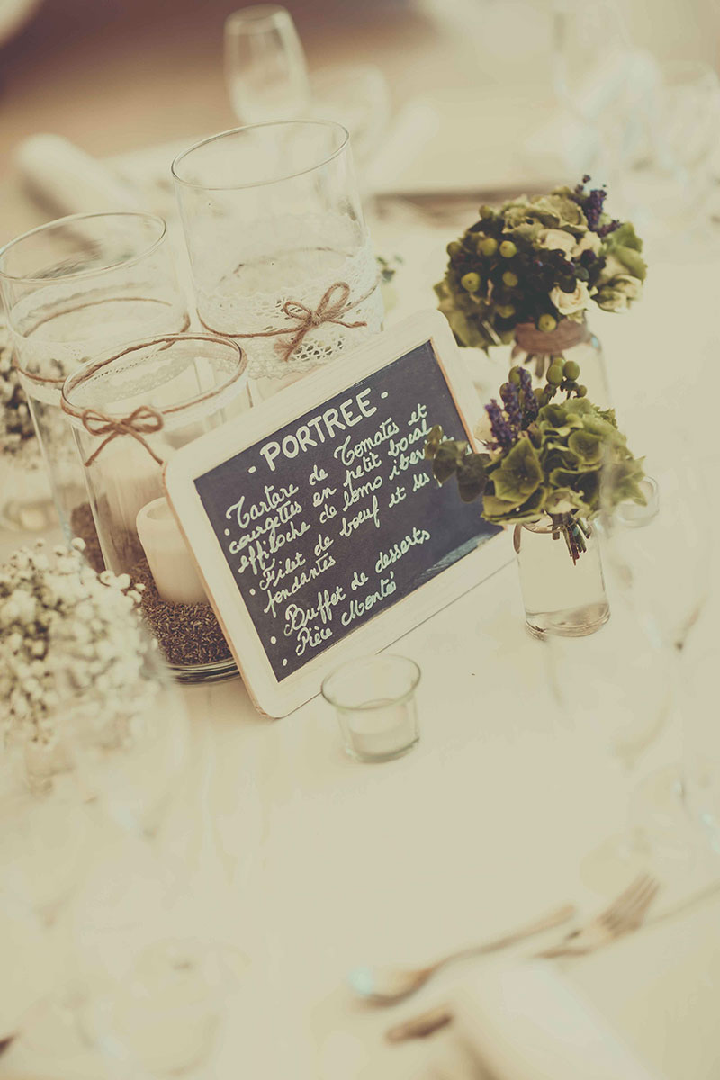 Le plan de table également créé par nos wedding planner avec des marques places customisés d’étiquettes et de brins de lavandes éteint disposés sur une vielle table en fer forgé. De vieilles bouteilles d’alcool  ont servis tant sur le plan scénographique qu’utile puisqu’elles venaient soutenir chaque marques places.