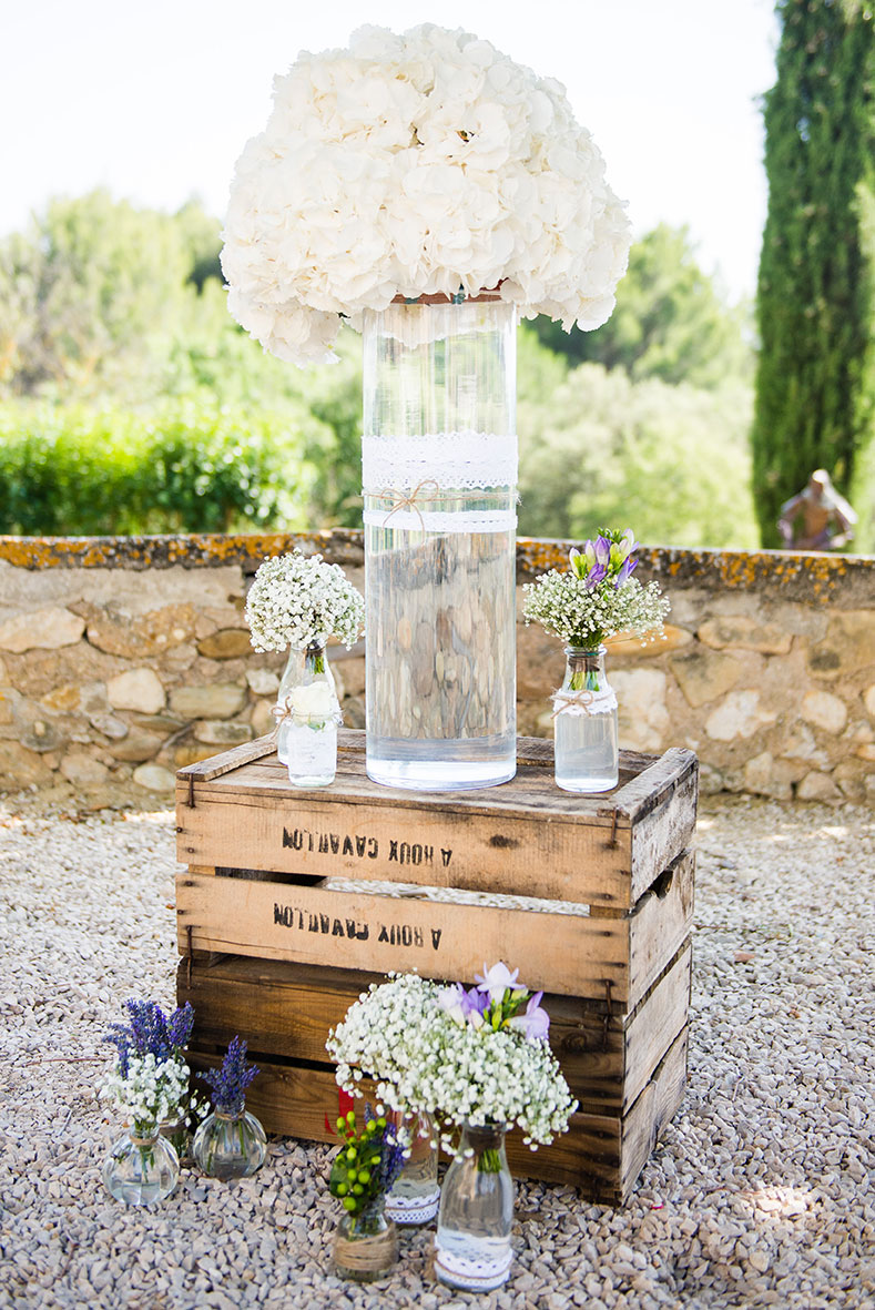 Une table proposant des cadeaux invités venait finalisé cette décoration mariage :  de vielles caisses à pommes venaient soutenir des pots de miel de Provence. Une idée originale qui a su satisfaire nos invités anglais et italiens.
