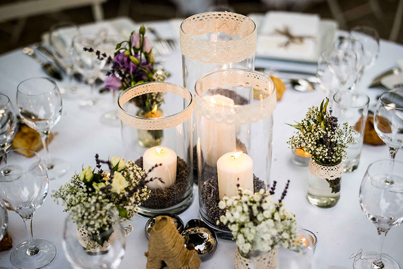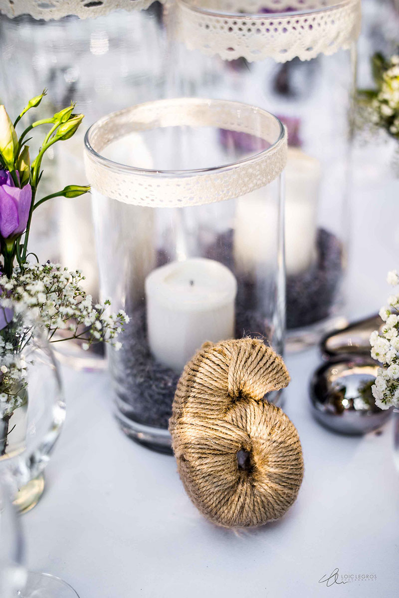Les tables décorées sobrement de trios de photophores transparents en centre de table, étaient customisés avec de la dentelle en cohérence avec le thème. Un cierge dans chacun d’eux étaient déposés pour amener le côté chaleureux. Le tout sublimé par des compositions florales déstructurées dans divers contenants.