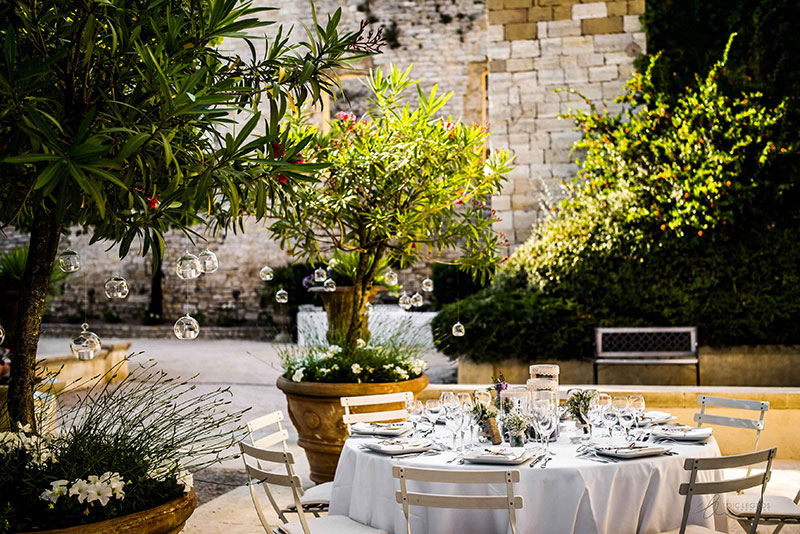 Nos wedding-planners ont également créé un décor sublime fait de suspensions de photophores accompagnées de bougies délicatement posées sur les murets en pierres sèches, typiques de la Provence, pour apporter un effet « coup d’éclat » et « candeur » à l’espace terrasse.