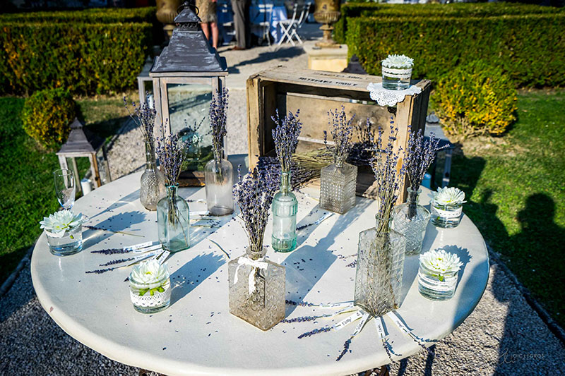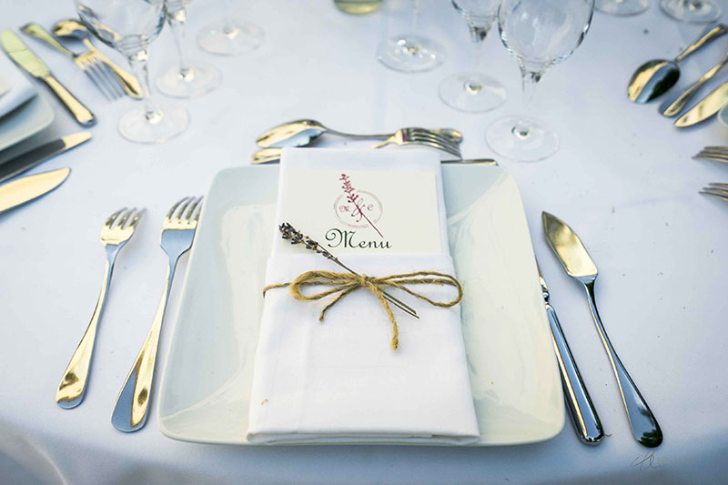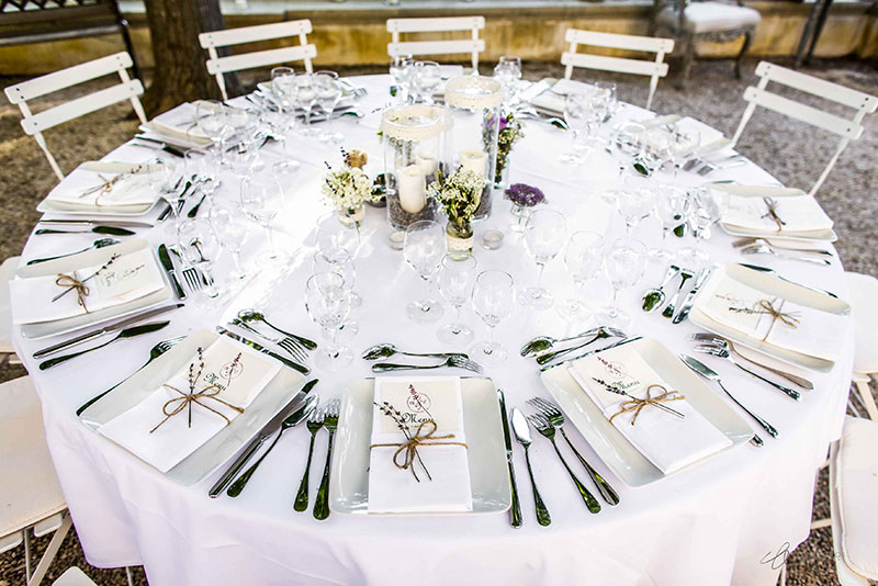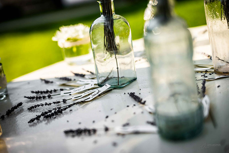 Les prénoms de chaque invité ont été étiquetés et enfilés un par un sur des brins de lavande, le tout stabilisé par de vieilles bouteilles de whisky pour pallier à la petite brise provençale.