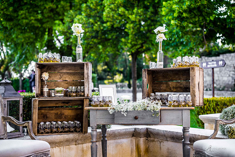 Nos organisatrices de label’ Emotion Provence ont aussi mis en avant un spot pour le livre d’or et les cadeaux des invités qui n’a pas manqué de plaire aux convives. Pour cela, elles ont agrémenté une table ancienne à l’aide de vieilles caisses à pommes où étaient disposés les cadeaux.
